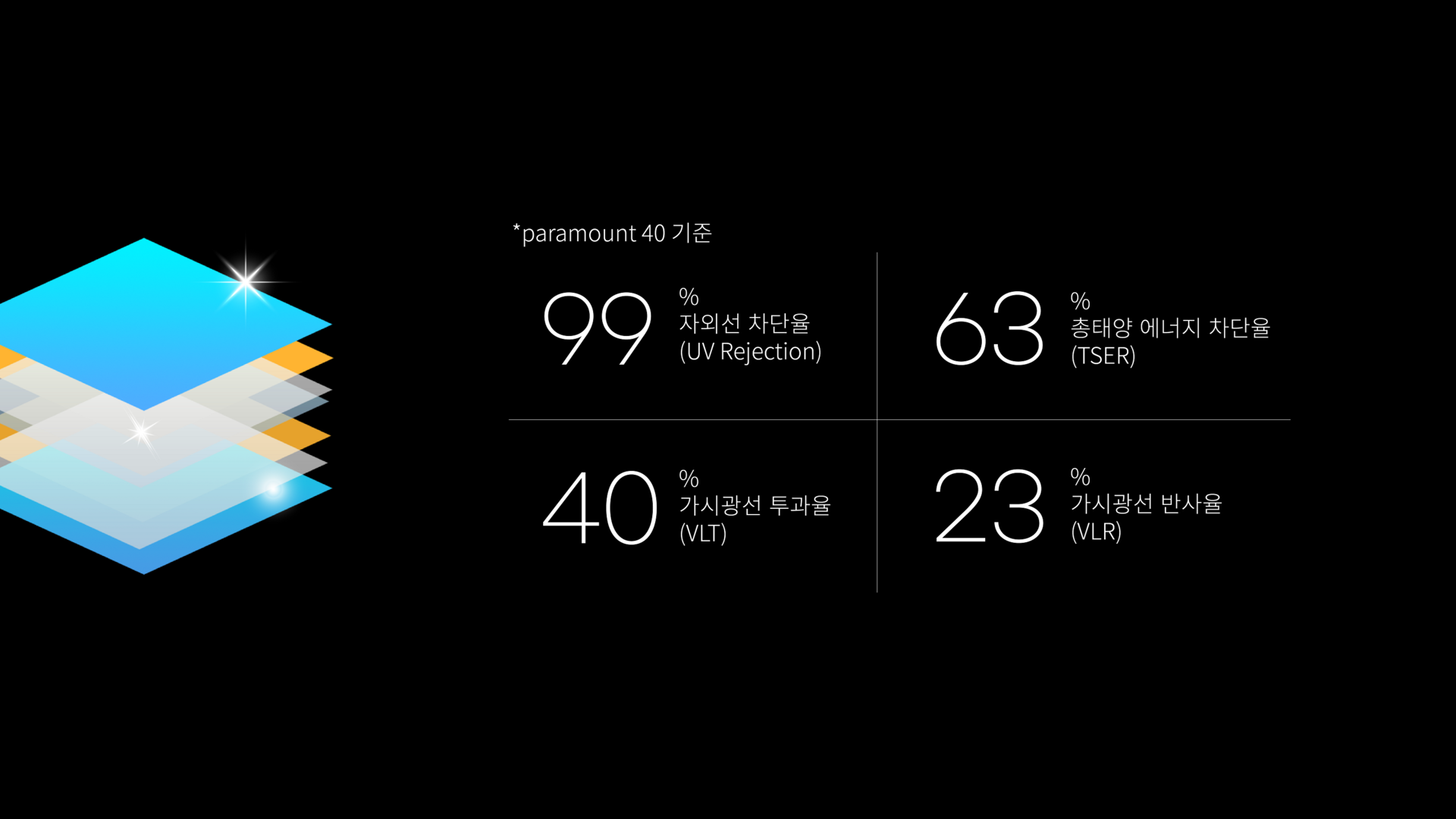 자외선 차단율 (UVR, Ultraviolet Rejected) 자외선을 얼마나 차단할 수 있는지를 나타내는 지표입니다. 자외선은 피부 노화나 질병의 원인, 내장재의 탈색·변형을 일으킬 수 있어, UVR이 99% 이상인 제품을 선택하는 것이 중요합니다. 단, 필름의 자외선 차단 성능은 사용 연한과 함께 점차 감소할 수 있으므로, 보증기간 확인과 주기적인 교체가 필요합니다.
