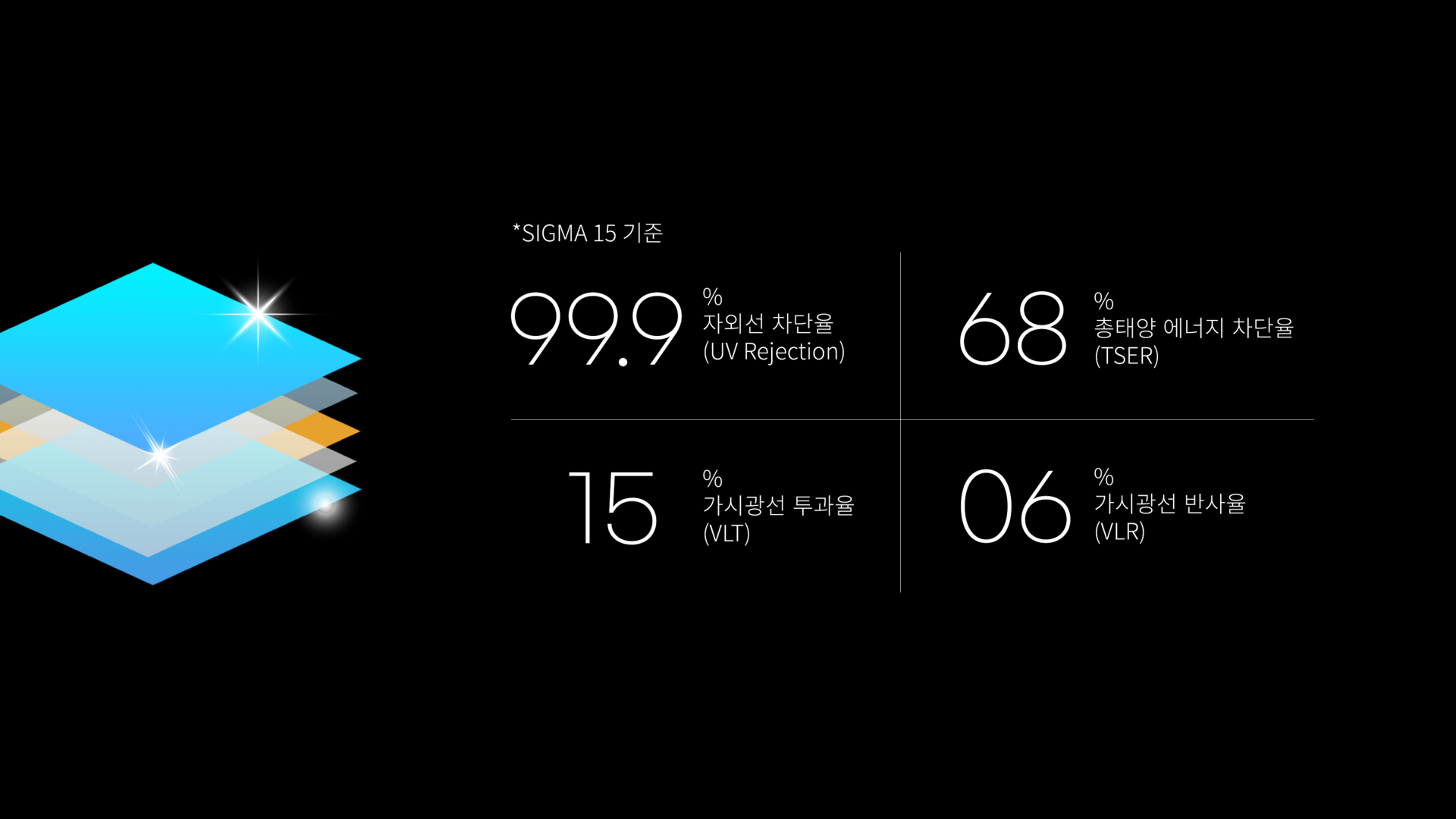 자외선 차단율 (UVR, Ultraviolet Rejected) 자외선을 얼마나 차단할 수 있는지를 나타내는 지표입니다. 자외선은 피부 노화나 질병의 원인, 내장재의 탈색·변형을 일으킬 수 있어, UVR이 99% 이상인 제품을 선택하는 것이 중요합니다. 단, 필름의 자외선 차단 성능은 사용 연한과 함께 점차 감소할 수 있으므로, 보증기간 확인과 주기적인 교체가 필요합니다.